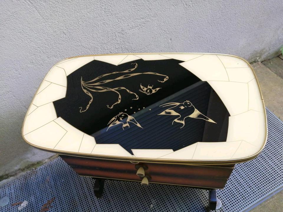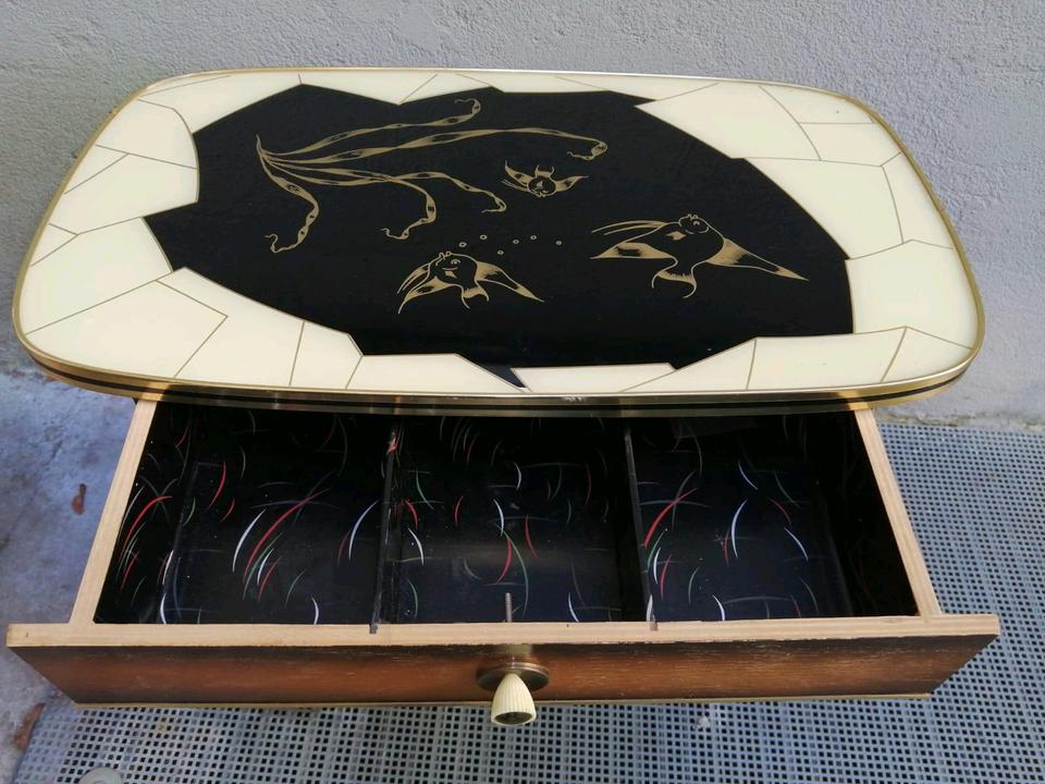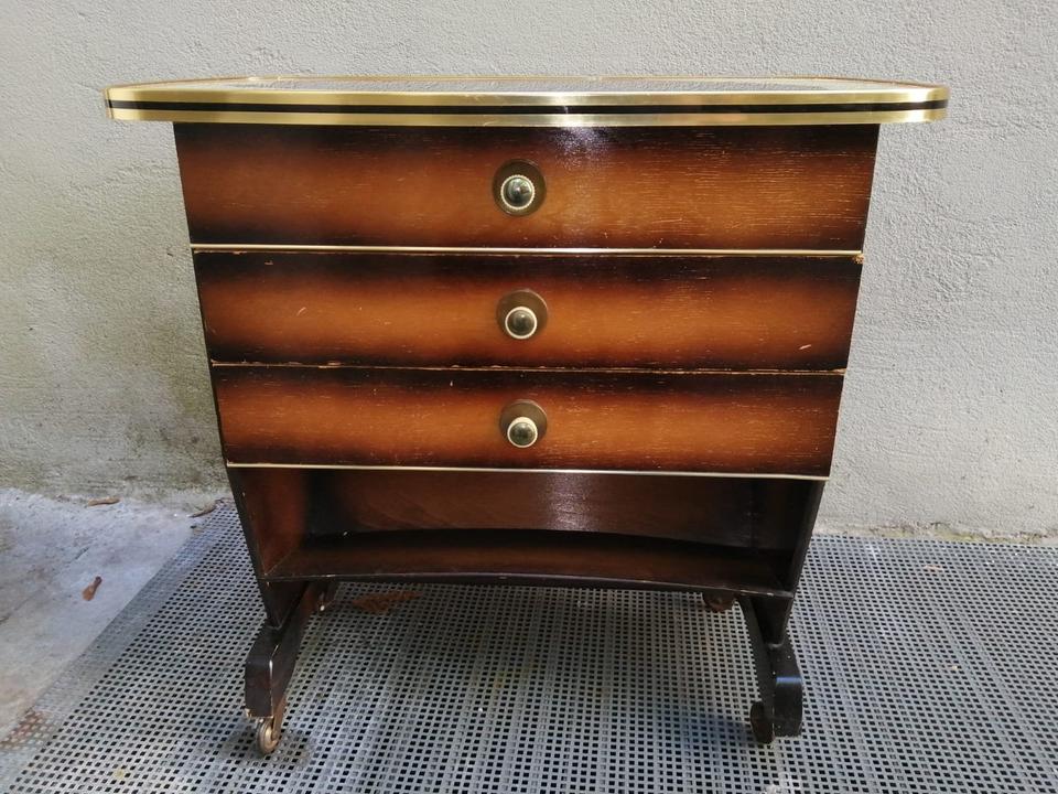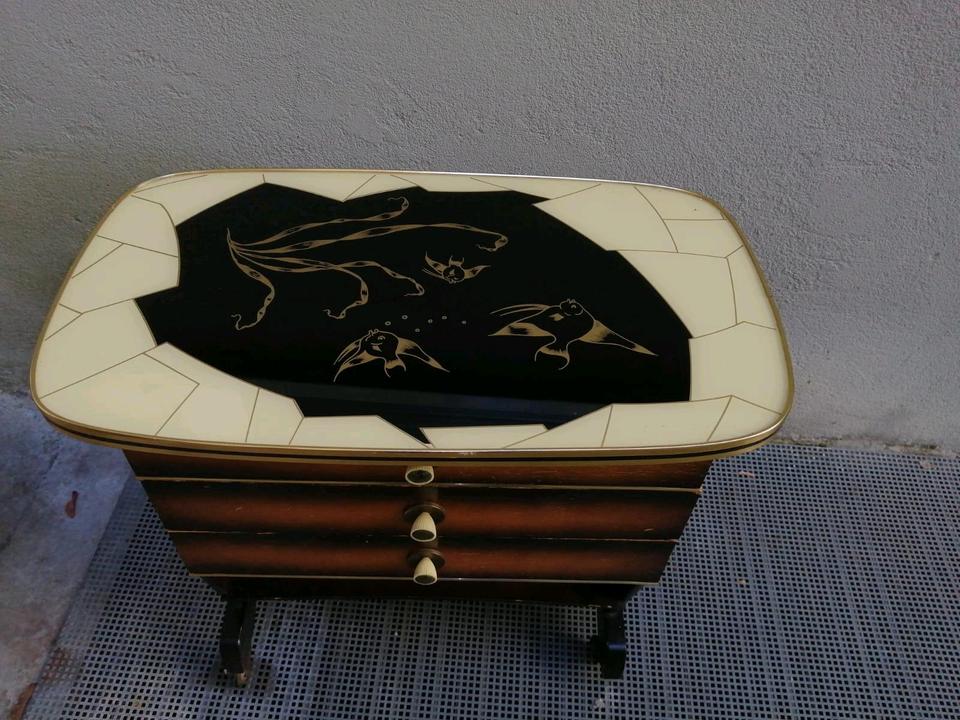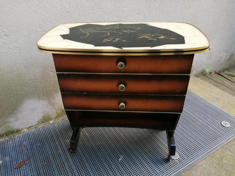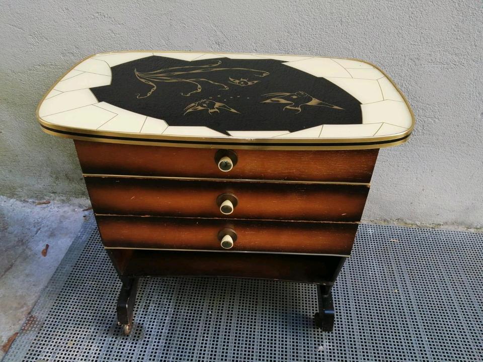 Das ist ein alter, aber schöner Beistelltisch mit Schubladen.
