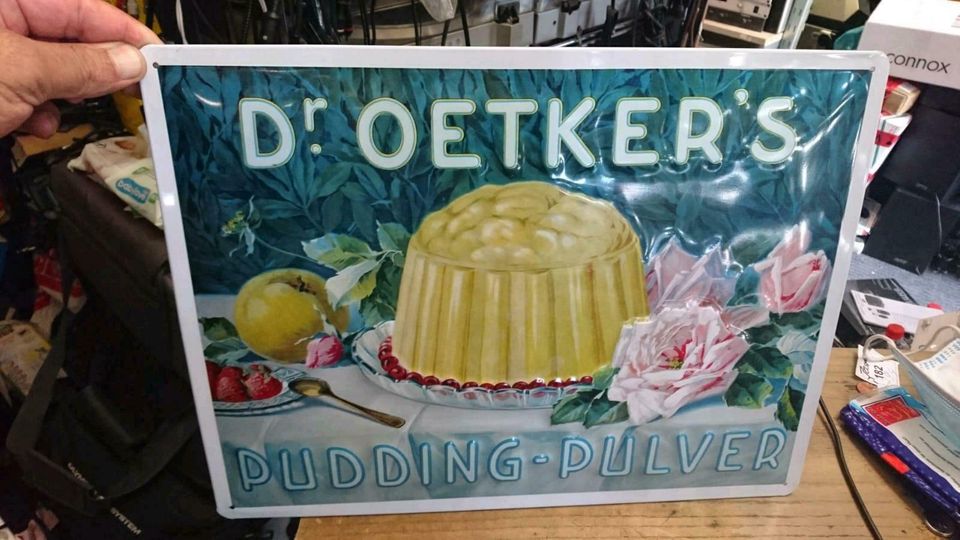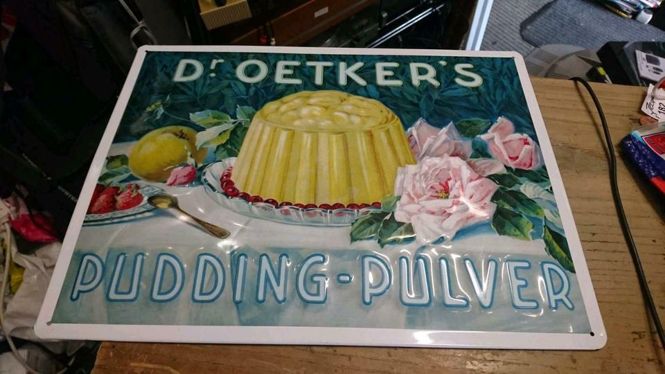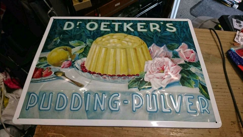 Dies ist ein tolles und schönes Blechschild. "Dr. Oetker's Pudding-Pulver"