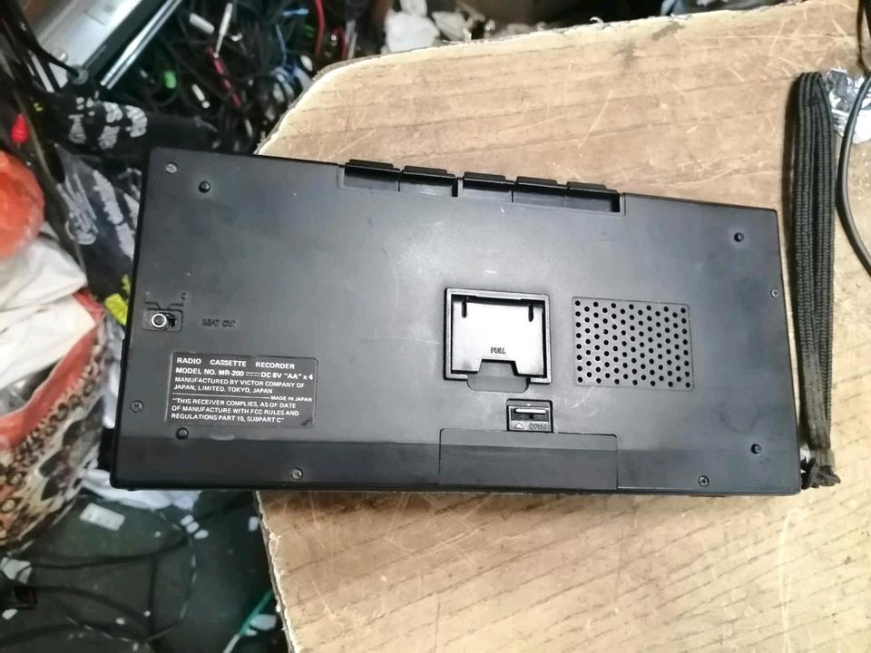 Dies ist ein toller Radio-Cassettenrecorder von JVC. PLAY funktioniert sehr gut. Vor- und Rücklauf funktionieren, aber sehr langsam!! Antenne ist vorhanden und in Ordnung. Batteriefach ist sauber.