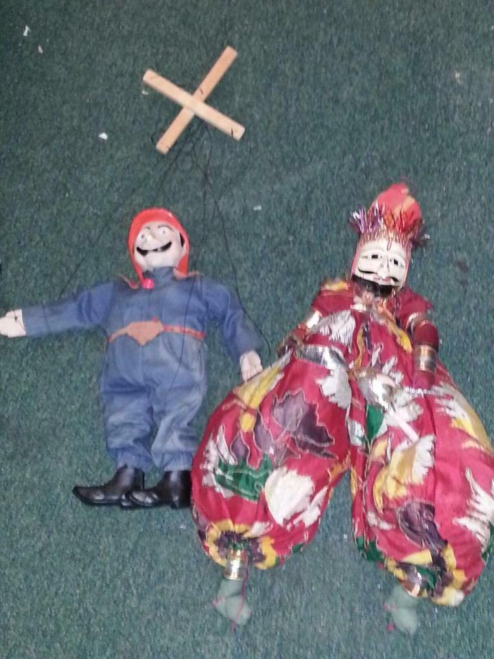 2 tolle und schöne Marionetten. 1 kleiner Feuerwehrmann(34 cm groß) funktioniert sehr gut. Die andere Marionette sind leider die Fäden ab. Größe: 50 cm.
