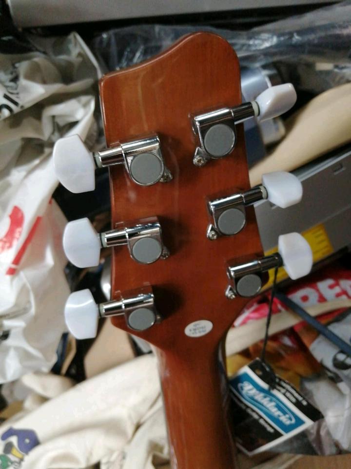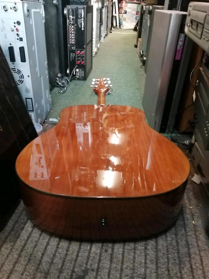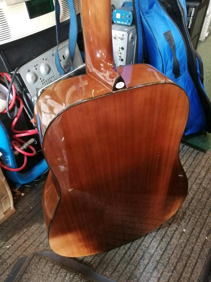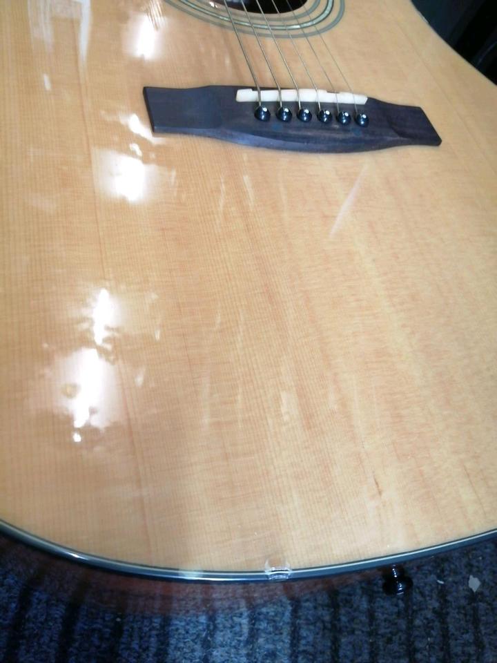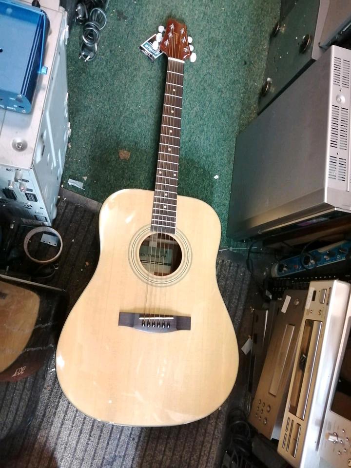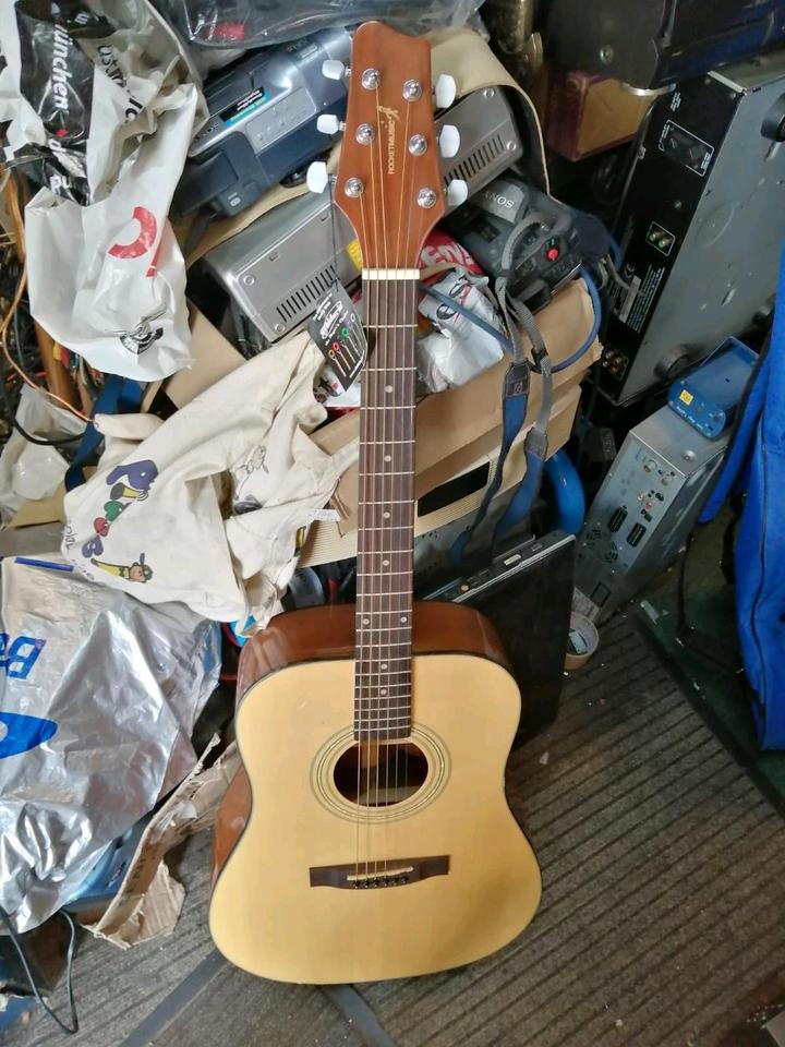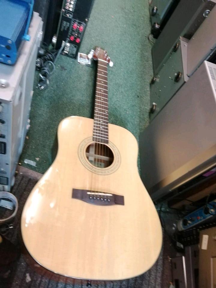 Eine schöne und tolle Akustik-Gitarre. Funktioniert sehr gut. Mit einer Tasche. Mit Metall - Saiten.