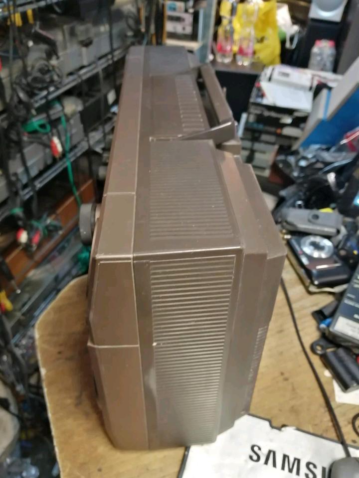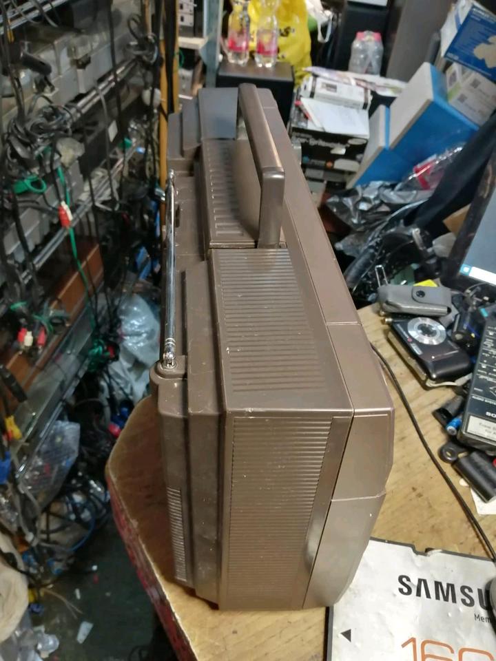 Das ist ein Stereo Radio-Cassetten-Recorder von SHARP. Radio funktioniert sehr gut. Beim Cassettenteil geht nur der Rücklauf. Wahrscheinlich muss der Antriebsriemen gewechselt werden. Mit einem Netzkabel.