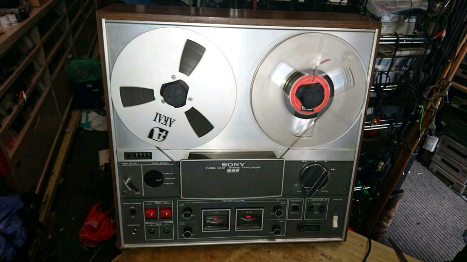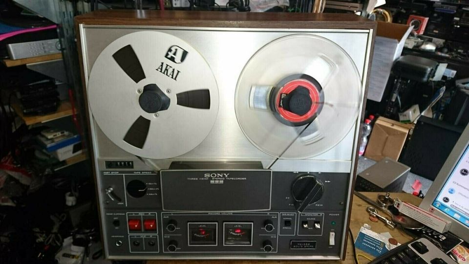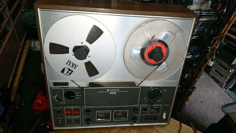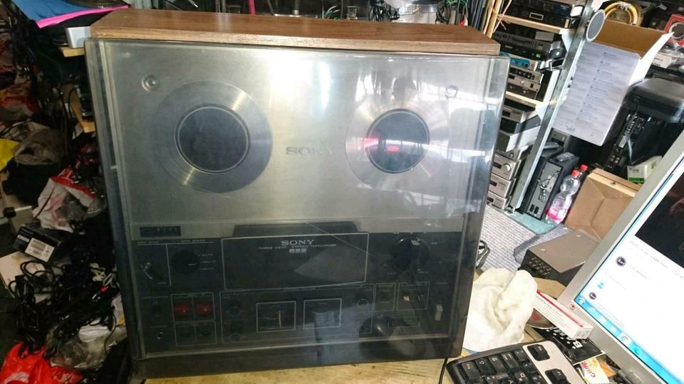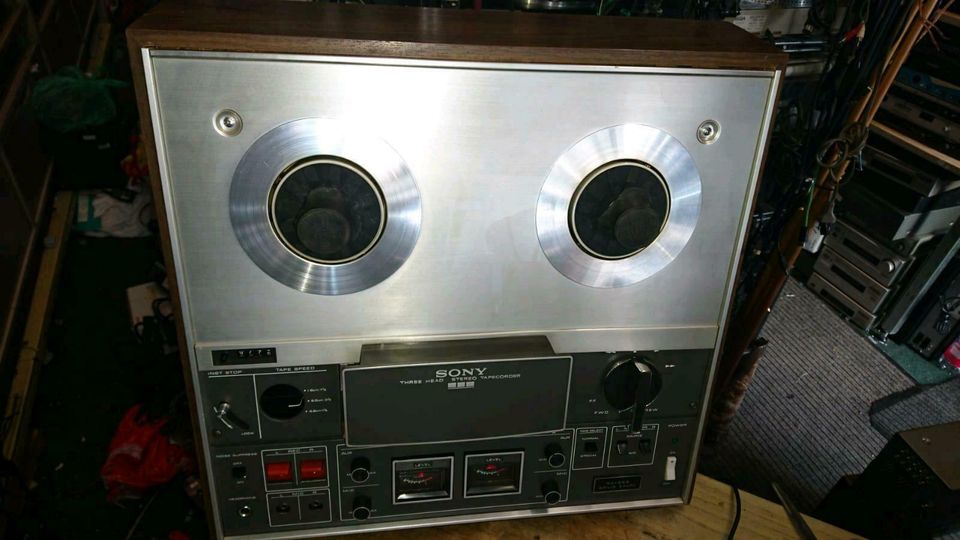 Das ist ein schönes und tolles Tonbandgerät von SONY. PLAY funktioniert sehr gut, aber Vor- und Rücklauf gehen ganz schwer, wenn Spulen drauf sind! Ohne Bänder geht es gut. Hat ein festes Kabel. Original-Beschreibung. Deckel vorhanden, aber etwas beschädigt (siehe letztes Foto)