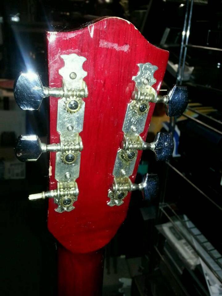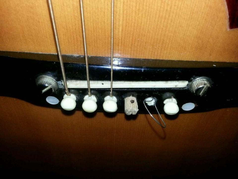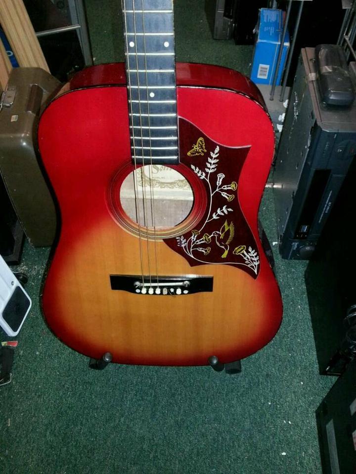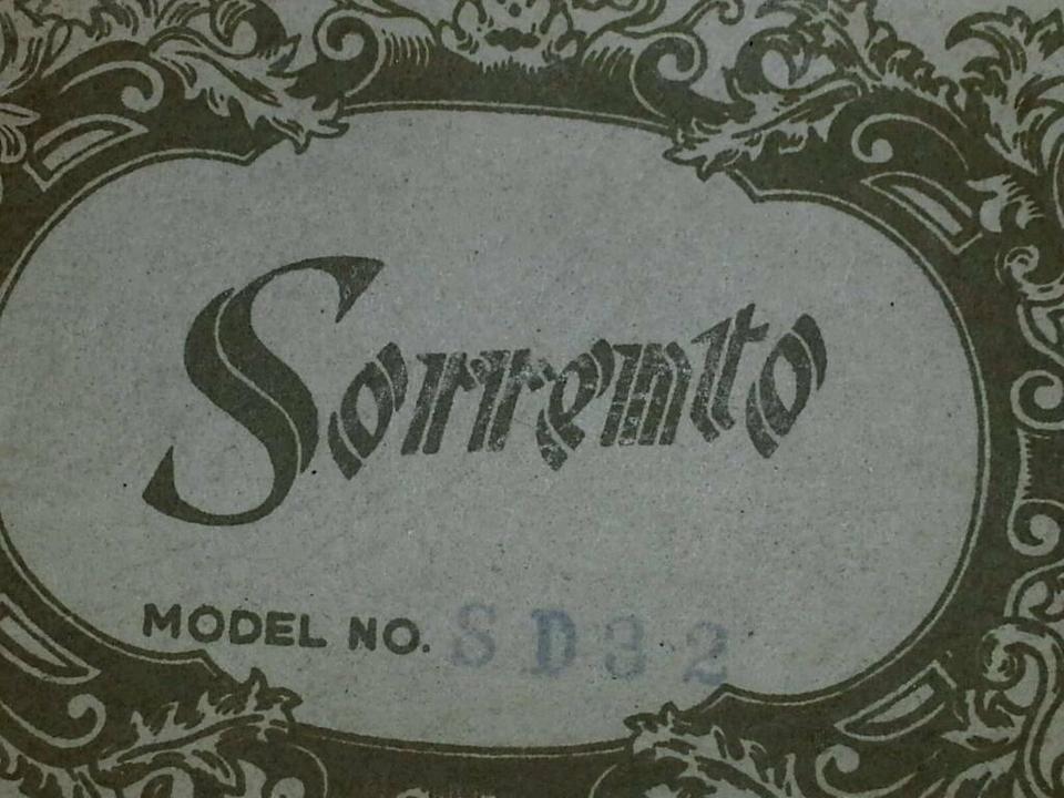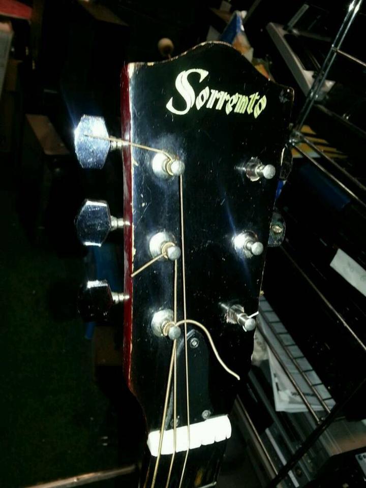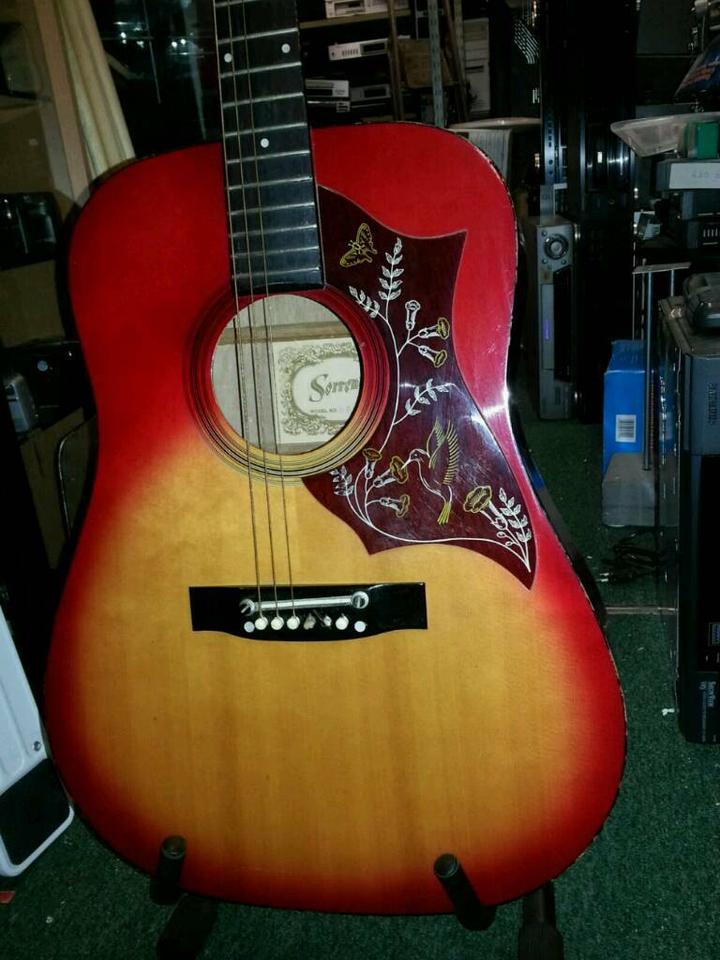 Eine tolle Akustik-Gitarre von SORRENTO Model Nr. SD 32. 3 Saiten fehlen und 1 Befestigung für 1 Saite (siehe Fotos). Trotz der fehlenden Saiten, sieht die Gitarre gut aus. Hat nur leichte Gebrauchsspuren.