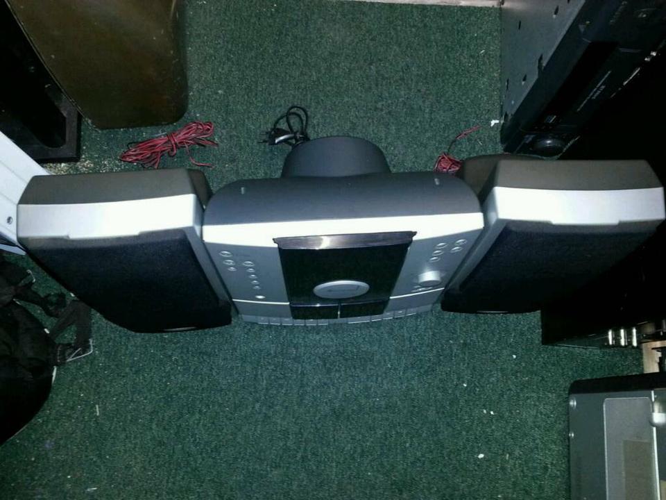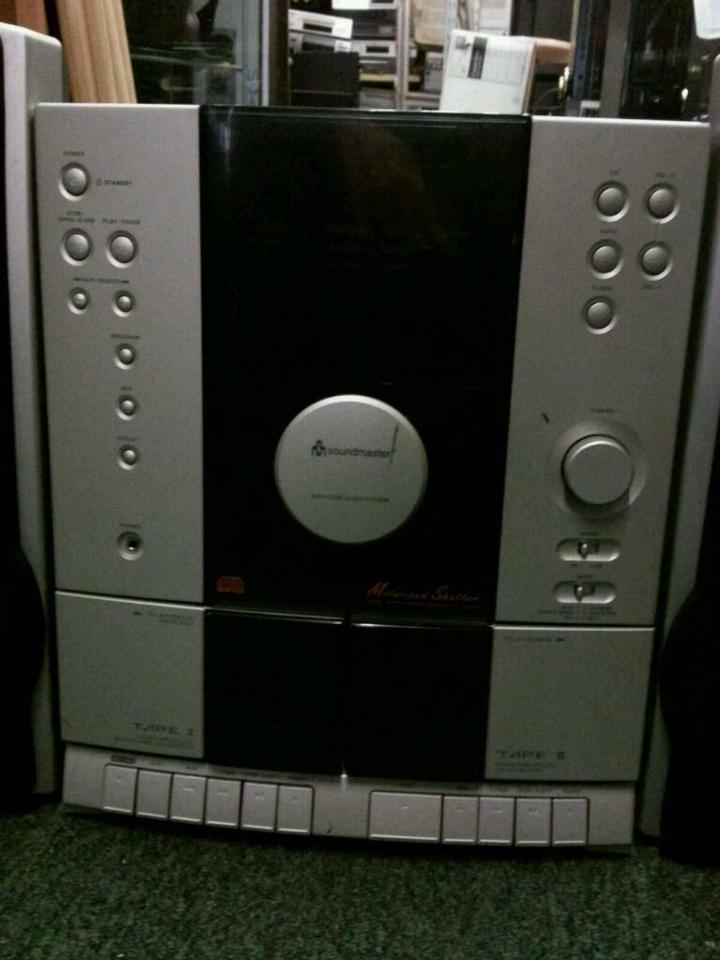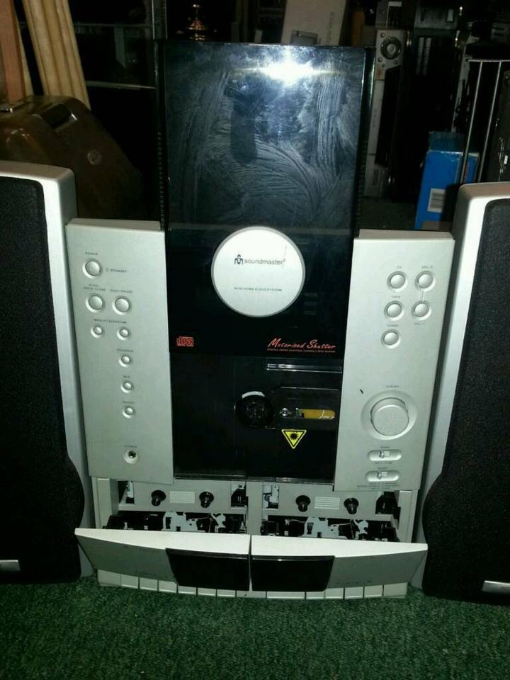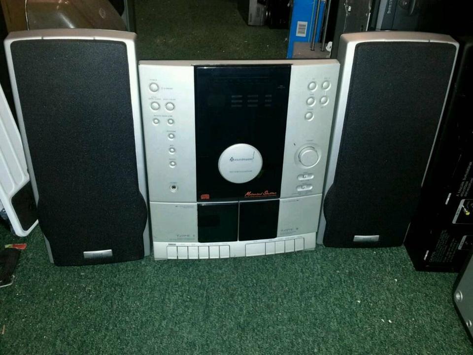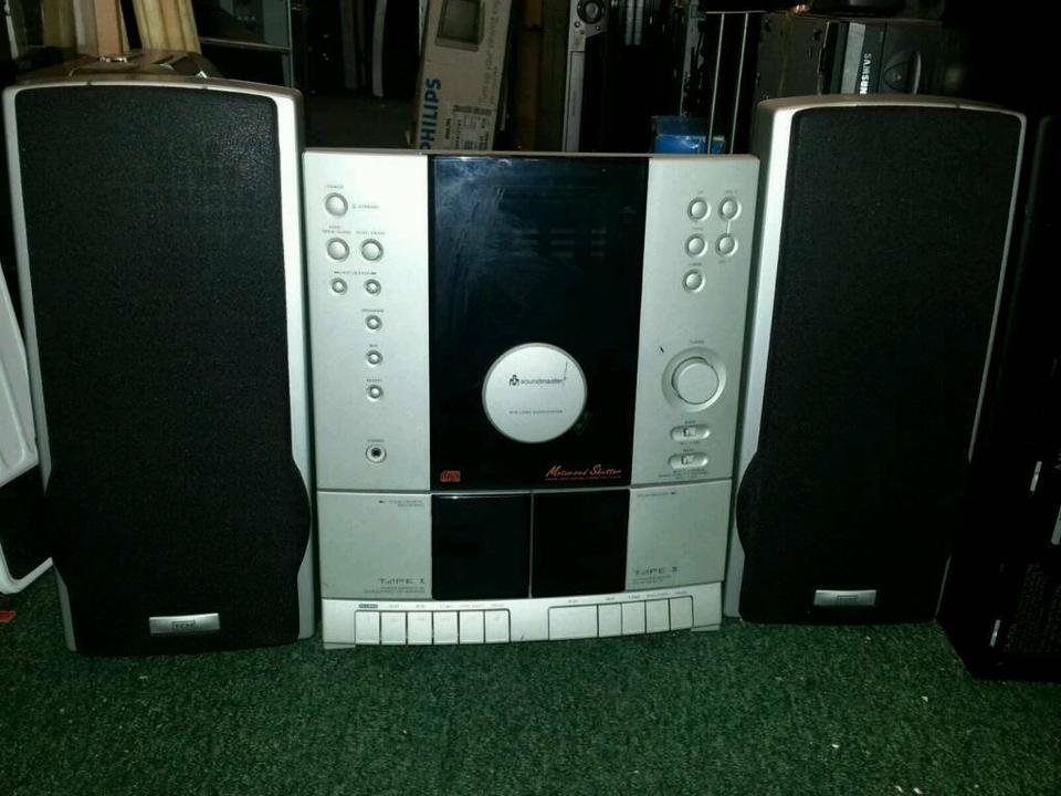 Eine tolle kleine Musikanlage von SOUNDMASTER. Funktioniert sehr gut. Mit 2 Boxen(4 Ohm), Doppel-Cassettenteil, CD, Radio. Festes Kabel. OHNE Zubehör! Das Mini Home Audio System sieht gut aus. Hat nur leichte Gebrauchsspuren.